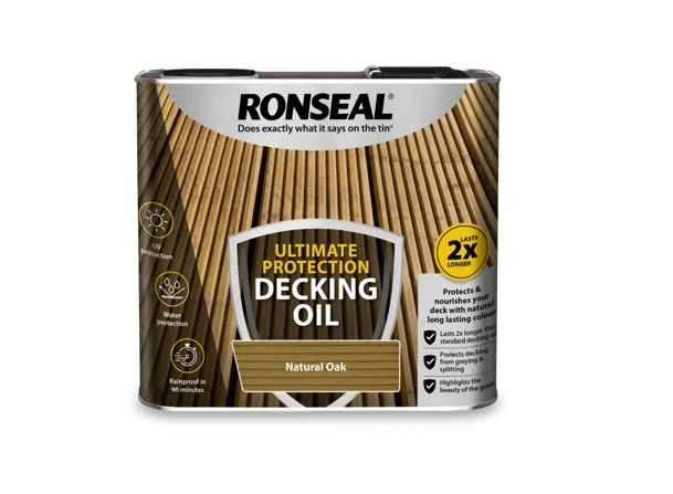 Ronseal Ultimate Protection Decking Oil is designed to keep your decking looking its best while providing durable protection against the elements. It deeply nourishes the wood to prevent drying, while also guarding against scuffs, knocks, greying, and splitting. Offering performance that lasts twice as long as standard decking oils, it enhances the natural appearance of the wood and becomes rainproof in just 90 minutes, making it a reliable and long-lasting solution for outdoor decking care.